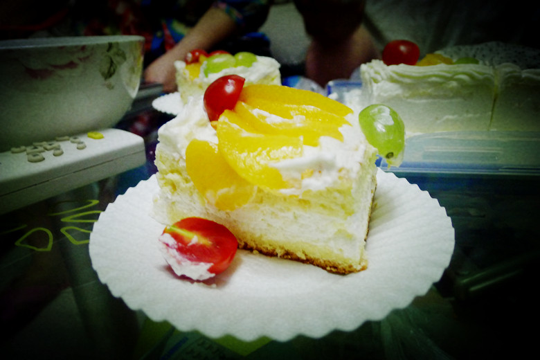 及以下步骤:在家里翻出个裱花嘴,套上裱花袋,像学人家大师傅拉几朵奶油花呢。可是这淡奶油,一隔着袋子被我摸,它就化了,所以我弄的花边都是歪歪扭扭的,反正你也吃不上,是吧,哈哈,那就这样吧 黄桃,切片,摆摆~~摆个造型 继续放各种水果 ok了,最后就是个这效果了,不管好不好,俺水平就这样了。 来张lomo风格 切开,嗯,哄哄老人家还是马马虎虎的嘛。这个6寸戚风奶油蛋糕,均分后正好是6块,各位算好人头再做哈。虽然看起来挺复杂,做起来很简单。下个月某人生日,准备挑战下提拉米苏!拜拜了各位 继续放各种水果 ok了,最后就是个这效果了,不管好不好,俺水平就这样了。 来张lomo风格 切开,嗯,哄哄老人家还是马马虎虎的嘛。这个6寸戚风奶油蛋糕,均分后正好是6块,各位算好人头再做哈。虽然看起来挺复杂,做起来很简单。下个月某人生日,准备挑战下提拉米苏!拜拜了各位