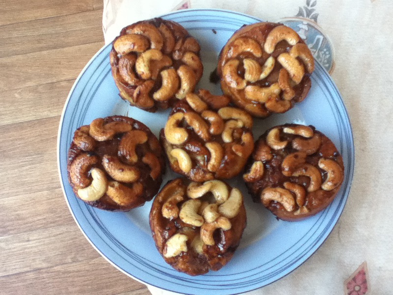 及以下步骤:将所需要的材料再展现一遍,所填‘适量’,是因为请根据自己的烤盘大小和口味的轻重选择。 将黄油放入微波炉融化。 将所需要的材料再展现一遍,所填‘适量’,是因为请根据自己的烤盘大小和口味的轻重选择。 将黄油放入微波炉融化。 将所需要的材料再展现一遍,所填‘适量’,是因为请根据自己的烤盘大小和口味的轻重选择。 将黄油放入微波炉融化。 把红糖分成均匀的等分,放入每一格的黄油中,用筷子搅匀。 把腰果平均的放在里面,要将每个腰果一份为二,将平面朝上,便于粘在蛋糕上。 (也可以使用其他坚果代替,但一定要将平面朝上。) 在面粉中放入全部的泡打粉,加入牛奶搅匀。 搅好后的是比面糊略干一些,然后用勺子舀进烤盘。 倒入面糊后,把烤盘轻轻的磕一磕。然后放进烤箱,180度,考18-20分钟就好了。
