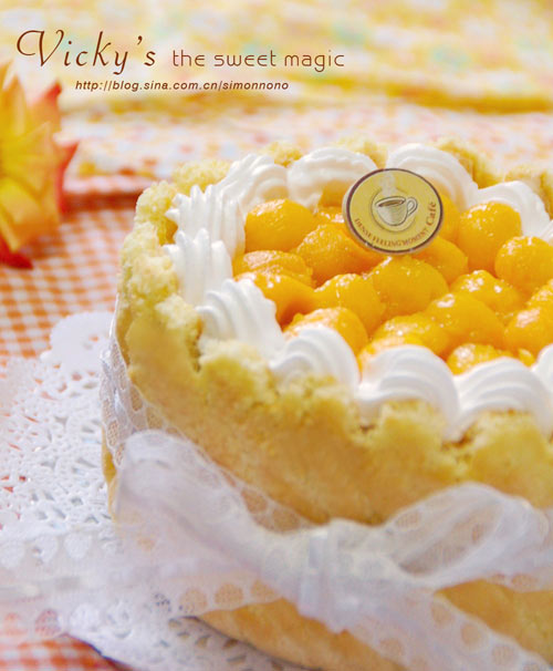 及以下步骤:烤盘铺上油纸.将面糊装入裱花袋,裱花袋口剪开8毫米的口,把面糊以如图的形式裱在烤盘里.撒上糖粉,静置一分钟再撒一次糖粉.放入预热的烤箱,上下火.175度烤约10分钟.(烤箱之间有差别,烘烤温度和时间根据烤箱调整. 把烤好的蛋糕片裁成6寸模具的高度.(做围边的),再裁一片圆片(蛋糕底).切口处超下,先放围边再放圆底,如图放入模具(可以在模具周围铺油纸) 吉利丁泡在凉水里,将其泡软.将芒果用料理机打成泥(喜欢大果粒的可以,少打会,我就喜欢大果粒的,所以里面处处见芒果哦).再将芒果泥,牛奶,22克细砂糖倒入奶锅里开小火熬成酱装,再放入泡好的吉利丁.放凉备用. 将奶油奶酪加入10克糖粉 将奶油奶酪隔热水打至顺滑的状态. 将动物淡奶油隔冰水打至8成发.(这次我打的太发了,最后糊糊太稠不好装入模具.) 将1/3的奶油盛入奶酪碗里,翻拌均匀,再倒回剩下的奶油里搅匀 倒入放凉的芒果酱,并翻拌均匀.最后倒入一小勺新鲜柠檬汁,拌匀后就可以倒入模具,上方抹平,放冰箱冷藏4小时以上.等取出后就可以脱模装饰了. 脱模后开始装饰,放上芒果粒 系上蕾丝带,大功告成