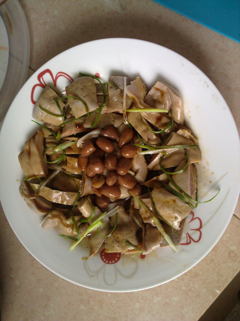7、第二天起来已经是十一点了,正好拿出来切盘,装盘.大家无视我稀烂的刀工和毫无美感的摆盘吧.然后浇上自制调味汁就好了,根据我家的口味,我放的是甜醋+陈醋+白胡椒+美极鲜味汁+味极鲜酱油(这两个不是一样吗?no,no,味道真的不一样)还有一点香油,撕几条葱,堆上花生米就大功告成了!哦也~~~其他调味汁的做法大家去看百科吧,那样味道可能更地道.