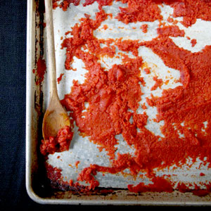 3、3:剩余的2汤匙油用来涂烤盘。把番茄酱均匀倒入烤盘,直到大部分水分蒸发和表面变暗(大约3个小时),温度调到250°;煮至厚和转色大概要20-25分钟。
