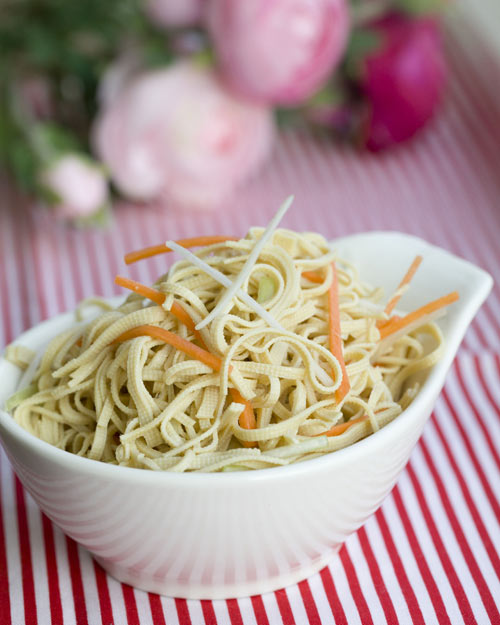 及以下步骤:干豆腐放在开水中焯一下。 焯好的干豆腐晾凉。 干豆腐放在开水中焯一下。 焯好的干豆腐晾凉。 干豆腐放在开水中焯一下。 焯好的干豆腐晾凉。 整理成7厘米宽的长方形。 切成粗细一致的丝(长度7厘米)。 葱、胡萝卜切成7厘米长的细丝。 将适量的盐、味素、糖、香油放入容器中混合,放入干豆腐丝、葱丝、胡萝卜丝拌均即可