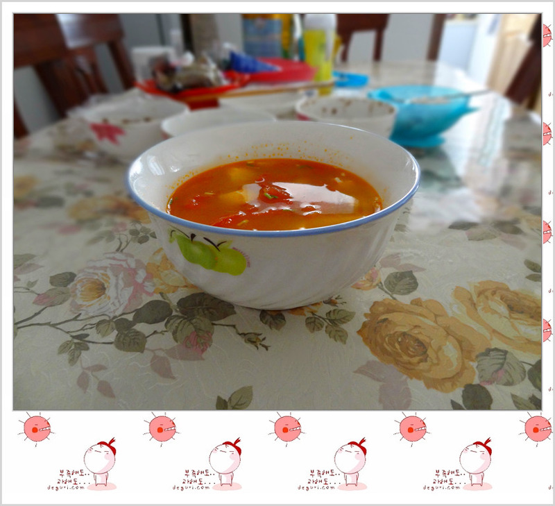 及以下步骤:开油锅,倒入番茄小火煸出红汤。 准备好食材。 开油锅,倒入番茄小火煸出红汤。 准备好食材。 开油锅,倒入番茄小火煸出红汤。 准备好食材。 开油锅,倒入番茄小火煸出红汤。 倒入豆腐,加半碗水。 中火烧十分钟,待汤色发红,番茄软烂即可,加入少许盐,小葱,盛起。 红色的汤汤,女儿的最爱。