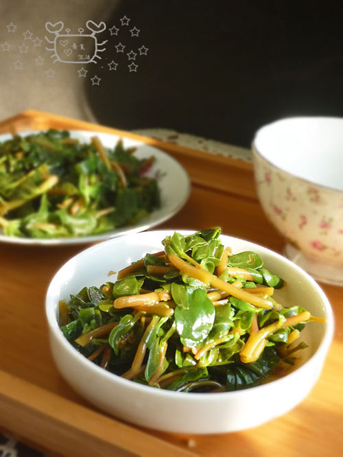 马齿苋凉拌稍稍有点酸,爱的人会大爱,不爱的人一口也不吃。从小吃过了这个味道,从来没有评价过这个菜是酸的,那天,女儿尝了一小口,问:妈妈,怎么这么酸啊,你加醋了?妈妈这才想到,这个菜的确是酸的,没有放醋也是酸的。 还好,女儿跟妈妈一样,喜欢酸味儿菜。 马齿苋跟蒜很搭配,只是家里一个也没有了,加之是早上,吃了蒜会有口气,换成泡椒了,很好吃。