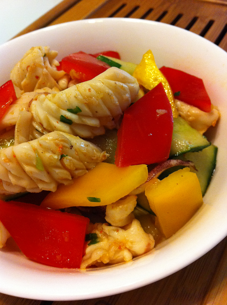 这两天深圳史上少见的持续超高温,稍稍动一动就冒汗,我这难得病一次的人也华丽丽的热感了。喉咙疼、鼻塞、头重、、、、、、难受得要死,胃口更是差。可不吃不行啊,病了更要需要补充营养。大鱼大肉、热锅小炒啥的免了;病了喝点汤水应该不错,可没精力、也没时间做,我们就来凉拌吧。 首次尝试将白灼后的鲜鱿鱼和彩椒再加上点青瓜来个大杂烩,按自己的想象调味拌起来,想不到味道还挺好,而且视觉效果极佳,颜色艳丽又不失清爽,又多了一道菜。也许是因为彩椒含有大量的vc,我这没吃药的人,第二天感冒居然好了很多,看来我不吃药多不出vc抗热感的决定是多么英明!