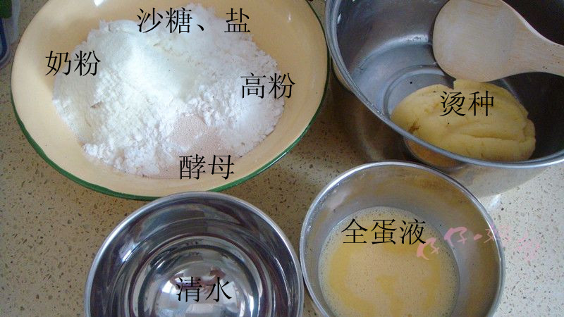 1、烫种面团:高粉75克,水53克,白糖6克,黄油30克。 主面团:高粉225克,白糖35克,盐3克,奶粉12克,酵母4克,全蛋液30克,水110克。 烫种的做法:把水、糖、黄油一齐放锅中加热,不用烧开,水冒小泡就停火,然后倒入高粉,搅拌成面团。冷却后加盖放入冰箱冷藏。我一般是头天做烫种,第二天有空再拿出来用,所以冷藏几至二十几个小时个人没感觉出什么不同,没办法,菜鸟+神经比较粗,想有什么心得体会也确实难了点。