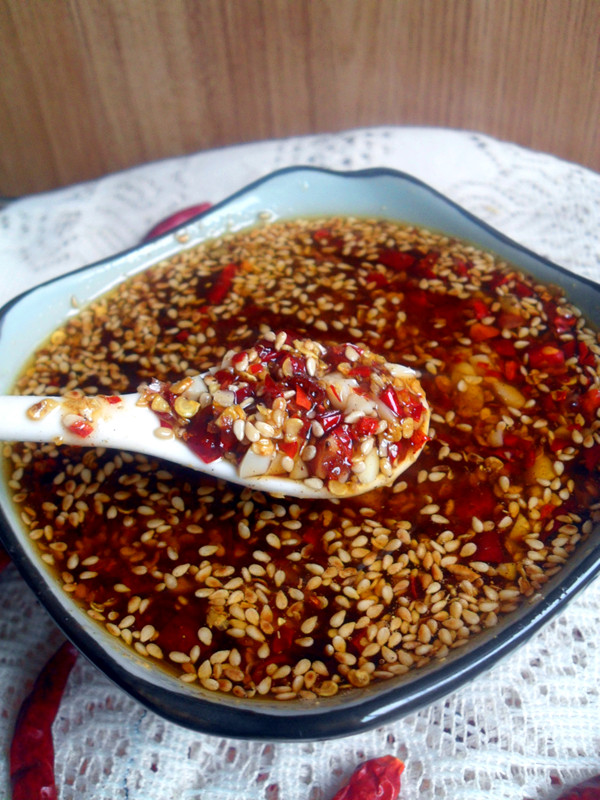 及以下步骤:备好材料。 花生在锅中翻炒一下,干辣椒,花生切碎备用。 备好材料。 花生在锅中翻炒一下,干辣椒,花生切碎备用。 备好材料。 花生在锅中翻炒一下,干辣椒,花生切碎备用。 辣椒碎,花生碎,芝麻倒在不锈钢碗里,倒入盐2勺,花椒粉1勺,五香粉半勺,搅拌均匀备用。 锅中倒入适量的油,倒入花椒,陈皮,八角,炒香。 把里面的材料过滤出来,留下油。 把油稍微放的有些凉,倒入辣子中,搅拌均匀后,再倒入些醋增加下口感就好了。。