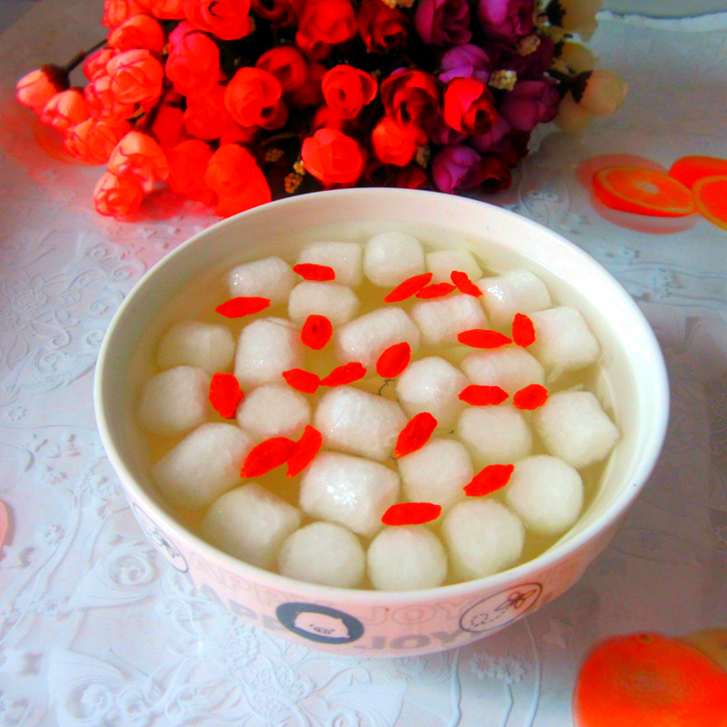 及以下步骤:处理成小球状形, 鲜冬瓜去皮, 处理成小球状形, 鲜冬瓜去皮, 处理成小球状形, 鲜冬瓜去皮, 处理成小球状形, 锅里放进清水烧开,倒进做好的小球烧开, 倒进碗里,加入4小勺白糖, 撒上构杞放进冰箱冷藏室3小时即成。清凉冰爽防薯降温