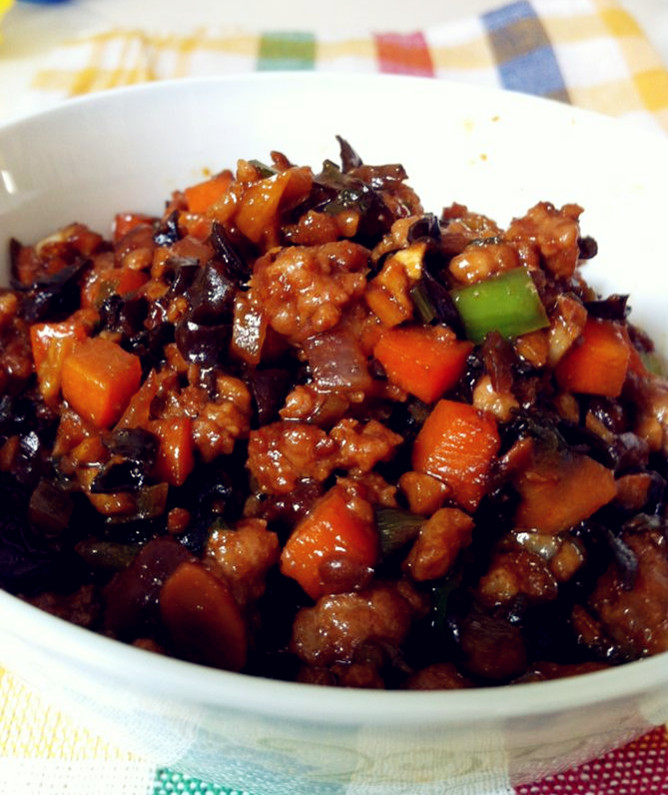 6、小火炒香豆瓣酱,加入胡萝卜丁,洋葱丁,辣椒丁,木耳丁,略微翻炒,临出锅加点鸡精,即可出锅。
