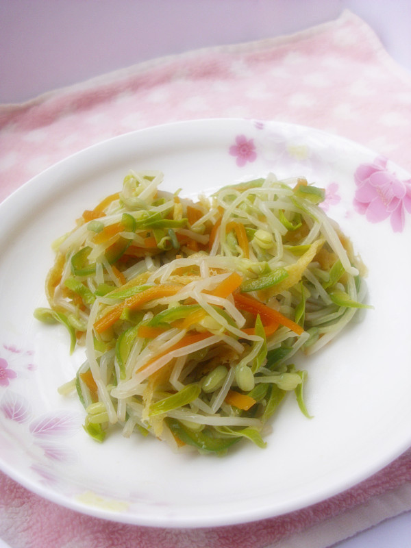及以下步骤:第三天,毛巾已经被顶到和蒸格差不多高了 盒子里装入适量的,放在豆芽菜上面,给豆芽菜施压,可以防止豆芽菜一个劲的往上长 把发好的豆芽菜,择取根部,清洗干净 取一个小锅加入适量的水煮沸 下入豆芽菜,氽烫至熟后捞出 胡萝卜切丝 放入小锅中煮3分钟左右至稍微变软后捞出 青椒切成丝 也放入小锅中氽烫至熟后捞出 把所有的东西放在一起,加适量的六月鲜特级酱油、鲜味汁、鸡精、白糖、芝麻香油,用筷子挑拌均匀即可食用