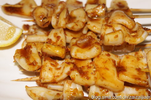 及以下步骤:1:將所有調味料放入果汁機中打成泥狀 即成蒜味烤肉醬 備用 2:鮮魷魚洗乾淨 切成一口的大小 放入滾水中汆燙約50秒(看魷魚肉的厚度適當加減)但千萬別汆燙太久 否則肉質會變硬并捲起 燒烤時反而不好 1:將所有調味料放入果汁機中打成泥狀 即成蒜味烤肉醬 備用 2:鮮魷魚洗乾淨 切成一口的大小 放入滾水中汆燙約50秒(看魷魚肉的厚度適當加減)但千萬別汆燙太久 否則肉質會變硬并捲起 燒烤時反而不好 1:將所有調味料放入果汁機中打成泥狀 即成蒜味烤肉醬 備用 2:鮮魷魚洗乾淨 切成一口的大小 放入滾水中汆燙約50秒(看魷魚肉的厚度適當加減)但千萬別汆燙太久 否則肉質會變硬并捲起 燒烤時反而不好 1:將所有調味料放入果汁機中打成泥狀 即成蒜味烤肉醬 備用 2:鮮魷魚洗乾淨 切成一口的大小 放入滾水中汆燙約50秒(看魷魚肉的厚度適當加減)但千萬別汆燙太久 否則肉質會變硬并捲起 燒烤時反而不好 3:汆燙好後 用竹籤串起來 4:塗上適量的蒜味烤肉醬 平鋪在網架上 170度 15分鐘 烤好後裝盤 擠上檸檬汁即可食用