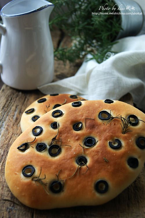 及以下步骤:将面团擀成整体厚度均匀的椭圆形,排入烤盘,进行最后发酵约30分钟。 发酵完成后,用手指在上面戳若干个孔洞,刷上厚厚一层橄榄油。 黑橄榄切片用厨房纸吸干水分,嵌入洞内;将迷迭香同少许盐撒放在橄榄之间。 烤箱预热200度,中层、上下火、20分钟。 发酵至原来的1.5倍到2倍大,呈现蜂窝状。 将面团取出排气,分割成两份滚圆后松弛15分钟。 将面团擀成整体厚度均匀的椭圆形,排入烤盘,进行最后发酵约30分钟。 发酵完成后,用手指在上面戳若干个孔洞,刷上厚厚一层橄榄油。 黑橄榄切片用厨房纸吸干水分,嵌入洞内;将迷迭香同少许盐撒放在橄榄之间。 烤箱预热200度,中层、上下火、20分钟。