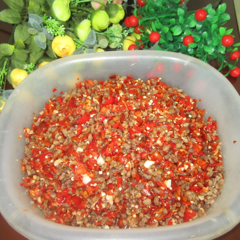 食材| 红辣椒5斤,蒜瓣1斤,发好孝的豆瓣5斤,菜酝子1个。 调料: 精盐,白糖,白酒, 方法: 1、蒜瓣去皮剁成蒜米。 2、红辣椒冼净凉干水分,剁成辣椒酱。 菜板一定要凉干水分哦,不然的话酝子里会起虫虫的哦。 3、发好孝的豆瓣酱加盐晒干备用。 4、剁好的辣椒酱加入蒜米,精盐, 5、再加入白糖和高度白酒拌均匀, 6、再把晒好的豆瓣酱倒进去拌匀。 7、再把拌好的豆瓣酱放进酝子里, 8、盖好盖,在酝边上放适量的水,如图。 9、放阴凉处半个月开酝,随吃随取。
