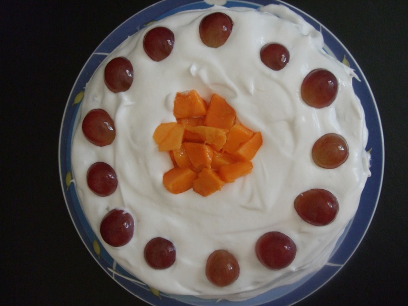 及以下步骤:继续打到起泡沫状再加10克白糖。 还是继续打,感觉有点像奶油了再加10克白糖继续打。 打好的蛋白是这个样子。记得分三次加白糖,蛋白才打得越来越细腻。 蛋白分出三分之一加入搅好的面糊里,上下搅拌均匀,切记不能打圆圈,不然会把蛋白打消的!(蛋白也是分三次加) 再把剩下的蛋白分出一半加入面糊继续上下搅拌均匀。 把剩下的蛋白继续加入上下搅拌均匀。搅拌好是这个样子有刨刨的感觉。 电饭煲锅底抹上薄薄一层油预热2分钟,把蛋糕糊慢慢倒入锅里稍微震几下震出气泡。 在上面撒上蜜豆。盖上盖子按蛋糕键就可以哦。(我用的是电压力锅,上面有蛋糕键) 倒出50克奶油,用打蛋器打发! 再用奶油涂抹在上面,加点葡萄,芒果做装饰,就ko啦!呵呵。。。第一次成功虽然还不是很漂亮,但还是很高兴哦!