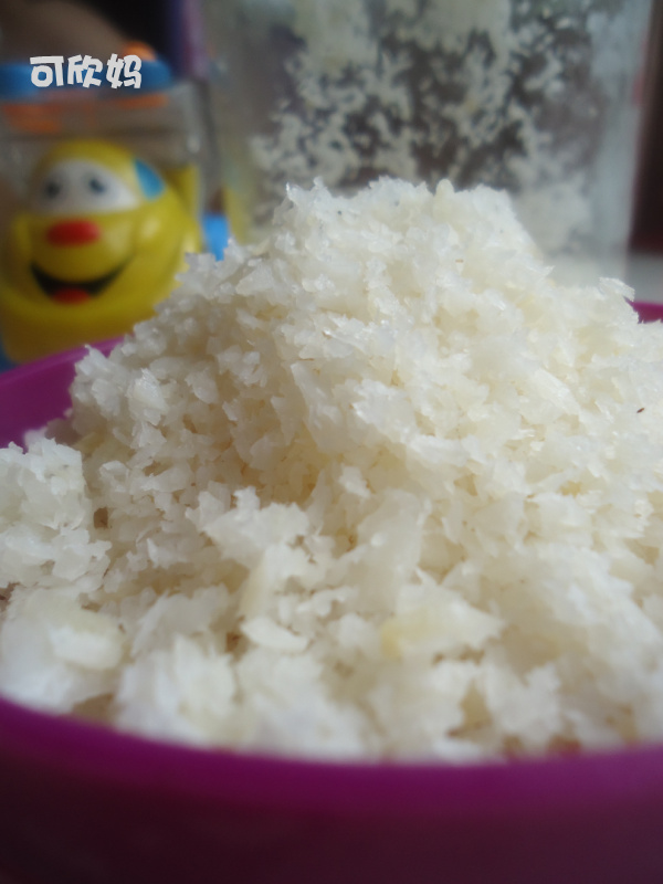 及以下步骤:椰子肉从椰子中取出,然后切成小块。 放入料理机打成丝。 椰子肉从椰子中取出,然后切成小块。 放入料理机打成丝。 椰子肉从椰子中取出,然后切成小块。 放入料理机打成丝。 打好倒出来,用手抓一下,有一些打不均的椰子肉挑出来不要。 然后倒入适量的幼砂糖。 用手给搅拌均匀即可。 然后用微波炉烘干,有烤箱就用烤箱比较好。