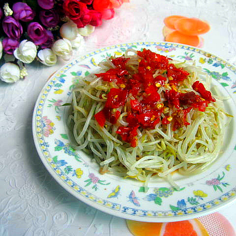 及以下步骤:将过好水的豆芽菜装达中, 把拌好的调料倒进豆芽菜上即成。 吃的时候拌匀即可。 豆芽菜去根冼净, 锅里放清水加盐烧开, 下入冼好的豆芽菜, 过开水, 煮2分钟捞出沥水。 调汁:剁辣酱适量,加入调料拌匀。 加入调料拌好的调汁。 将过好水的豆芽菜装达中, 把拌好的调料倒进豆芽菜上即成。 吃的时候拌匀即可。