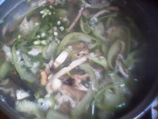 4、锅中放适量的水然后放入姜片加入切好的丝瓜斗鸡菇,煮到丝瓜斗鸡菇都八分熟时,放入码好的肉片用小火将肉片煮熟倒入放有葱花的盆中就大功告成了,