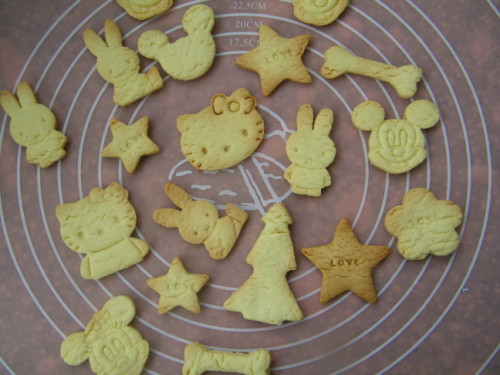 及以下步骤:面粉过筛后加入 面粉过筛后加入 揉成面团,醒15分钟。揉好的面团会比较粘手,放一会就会好些 案板上撒少量面粉放粘,把面团擀成面片,大概3-5mm厚 案板上撒少量面粉放粘,把面团擀成面片,大概3-5mm厚 下来就该压模啦,用自己喜欢的模具压成型就可以 下来就该压模啦,用自己喜欢的模具压成型就可以 很可爱哦 下来就该压模啦,用自己喜欢的模具压成型就可以 成品图