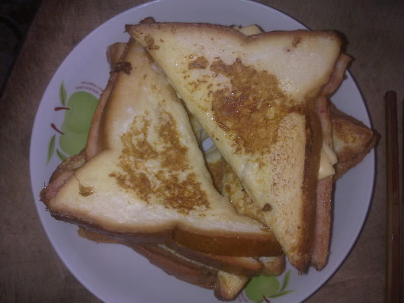 及以下步骤:这是所有材料,白吐司(我是买了一大袋),鸡蛋2个,芝士片(买的是减脂的),花生酱一瓶(夹在吐司里的,其实还有一瓶草莓果酱) 首先在两片吐司之间涂上花生酱,或者你喜欢的果酱,再放上一片芝士片,夹在一起就好,同时鸡蛋在碗里打成蛋液备用。 这是所有材料,白吐司(我是买了一大袋),鸡蛋2个,芝士片(买的是减脂的),花生酱一瓶(夹在吐司里的,其实还有一瓶草莓果酱) 首先在两片吐司之间涂上花生酱,或者你喜欢的果酱,再放上一片芝士片,夹在一起就好,同时鸡蛋在碗里打成蛋液备用。 这是所有材料,白吐司(我是买了一大袋),鸡蛋2个,芝士片(买的是减脂的),花生酱一瓶(夹在吐司里的,其实还有一瓶草莓果酱) 首先在两片吐司之间涂上花生酱,或者你喜欢的果酱,再放上一片芝士片,夹在一起就好,同时鸡蛋在碗里打成蛋液备用。 然后让处理好的吐司用刀子以对角线切成两半备用 将蛋液倒在盘子里,让切好的吐司外面沾满蛋液,然后放到油锅里煎至两面金黄即可。喜欢吃脆脆口感的可以煎的时间久一点。 煎好的一片,香喷喷,流口水啦 所有成品,哈哈,第一次的菜谱完成