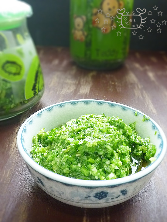 及以下步骤:材料图 韭菜苔,姜,洗净淋干水份,大蒜去外衣冲去灰土。 材料图 韭菜苔,姜,洗净淋干水份,大蒜去外衣冲去灰土。 材料图 韭菜苔,姜,洗净淋干水份,大蒜去外衣冲去灰土。 葱姜拍松后切块,韭菜苔切段。 本来准备用蒜臼捣碎,结果发现自己的胳膊有点痛,老毛病犯了,借助搅拌器全部打成菜碎,打了好多次,每次都均匀的加入蒜和姜。 往打碎的菜碎中加入盐糖,淋上白酒约30毫升,拌均匀。 装封闭好的瓶子中保存。常温下放一天后入冰箱或者直接放在通风干燥处,吃时取出淋香油或者辣椒油,配着饼子馒头或者粥,很不错的。