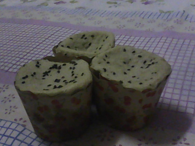 5、用小刷子在专用的蛋糕纸杯底部及四周抹上油,倒入蛋糕糊,撒上黑芝麻(葡萄干枣碎啥啥的都可以)