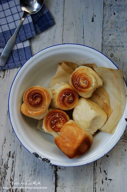 及以下步骤:取松弛后的面团,擀成牛舌状,由上至下卷起,松弛10分钟。 松弛的面团从中间一切两半。 切口沾少量水,再沾一下低筋面粉10克、砂糖5克混合的蘸料。 面卷等距均匀摆放在烤盘中。 放温暖湿润处进行最后发酵,约30分钟左右。 表面喷水、撒白芝麻,再往烤盘底部倒入适量色拉油。 烤箱预热180度,中层、上下火,烤制18分钟。 出炉后趁热表面刷蜂蜜水即可。 烤箱预热180度,中层、上下火,烤制18分钟。 出炉后趁热表面刷蜂蜜水即可。