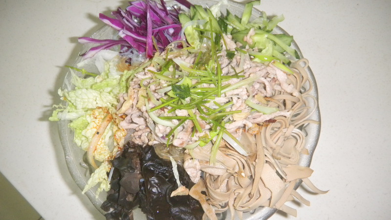 及以下步骤:加入少许香菜,将所有原料拌匀,即可 蒜剁成蒜泥,加入适量香油拌匀后放置5分钟 粉丝放入开水中煮2分钟,然后用凉水过一下;将洗净的黑木耳也用焯粉丝的水也烫一下后过凉水,备用 蒜剁成蒜泥,加入适量香油拌匀后放置5分钟 粉丝放入开水中煮2分钟,然后用凉水过一下;将洗净的黑木耳也用焯粉丝的水也烫一下后过凉水,备用 将紫甘蓝、白菜、黄瓜、豆皮、黑木耳均切成细丝,将粉丝控干水分后,所有原料均装入放有蒜泥的大碗中, 切少许肉丝、姜丝、葱丝备用 锅热后,倒入少许油,然后放入刚切好的肉丝,待肉丝变白后,放入葱丝和姜丝,稍翻炒后关火,将肉丝倒入大碗中 在碗中放入芥末、白糖、辣油、盐、味素均少许,再倒入鲜酱油(或生抽)、醋适量 加入少许香菜,将所有原料拌匀,即可