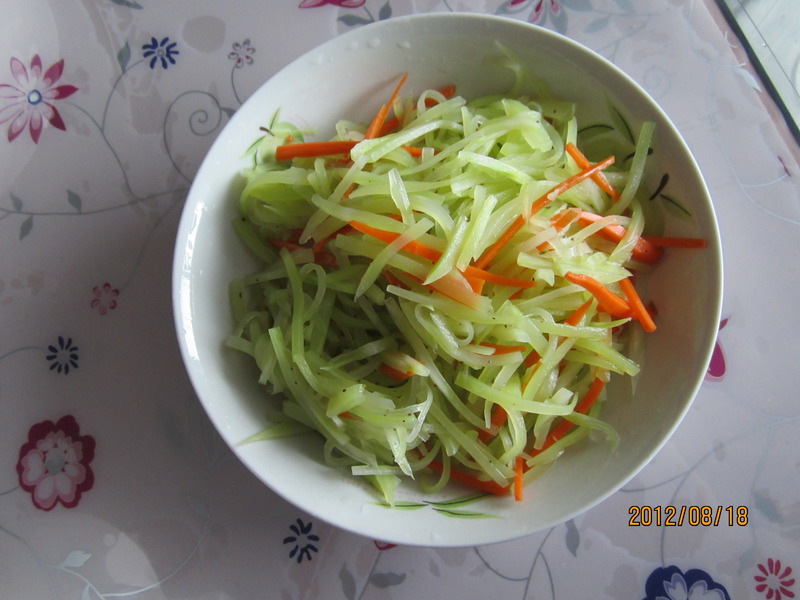 及以下步骤:准备好原材料 莴笋切成丝,倒入沸水中焯一下,捞出晾干备用。 准备好原材料 莴笋切成丝,倒入沸水中焯一下,捞出晾干备用。 准备好原材料 莴笋切成丝,倒入沸水中焯一下,捞出晾干备用。 准备好原材料 莴笋切成丝,倒入沸水中焯一下,捞出晾干备用。 胡萝卜切成丝 装入盘中,淋上香油,盐,糖即可上桌。