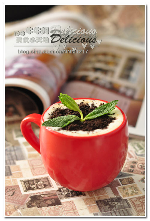 仙踪林有卖盆栽奶茶,很受人欢迎,不过貌似不难,开启我的头脑小风暴,自信应该做得出来。所以,今天我在家盆栽了一回,感觉挺成功,一杯普通的奶茶,上面放上奶油,再撒上奥利奥饼干碎,插上两片薄荷叶,真的很好玩,不过本人是用鸳鸯奶茶做的,可能比普通奶茶工序多了几步,不过嘛不管什么口味的奶茶都好,好喝就行。牛爸最近考试,奉上一杯精心制作的下午茶,得到了极大的好评哦!