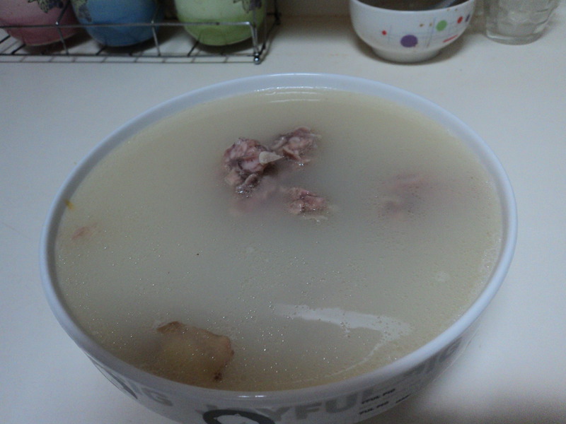 及以下步骤:汤放下去大概有大半锅。放入处理后的脊髓骨,放蒜头两个,生姜两片,绍酒两小勺,好了就这么简单。大火烧开转小火慢炖一小时以上。最后剩余小半锅水啦 把煮白鸭的汤水用纱布过滤掉油脂,这样就有了清澈的高汤,如果大家没有也没关系,一样可以让排骨汤很美味。 汤放下去大概有大半锅。放入处理后的脊髓骨,放蒜头两个,生姜两片,绍酒两小勺,好了就这么简单。大火烧开转小火慢炖一小时以上。最后剩余小半锅水啦 把煮白鸭的汤水用纱布过滤掉油脂,这样就有了清澈的高汤,如果大家没有也没关系,一样可以让排骨汤很美味。 汤放下去大概有大半锅。放入处理后的脊髓骨,放蒜头两个,生姜两片,绍酒两小勺,好了就这么简单。大火烧开转小火慢炖一小时以上。最后剩余小半锅水啦 把煮白鸭的汤水用纱布过滤掉油脂,这样就有了清澈的高汤,如果大家没有也没关系,一样可以让排骨汤很美味。 材料呢:主要排骨一斤(用脊髓骨也不错的哦,那里的软筋多,对孩子有好处)我用的就是脊髓骨。记得要先把排骨洗干净,放开水里焯个3分钟,去血水,这样处理后的骨头就很干净了。 材料:排骨一斤(用脊髓骨也不错的哦,那里的软筋多,对孩子有好处)我用的就是脊髓骨。要先把排骨洗干净,放开水里焯个3分钟,去血水,这样处理后的骨头就很干净了。 汤放下去大概有大半锅。放入处理后的脊髓骨,放蒜头两个,生姜两片,绍酒两小勺,好了就这么简单。大火烧开转小火慢炖一小时以上。最后剩余小半锅水啦 汤煮好后先不放任何的调料,要吃的时候盛点出来,可以加玉米、香菇或者木耳什么的,根据自己的口味加辅助材料,然后加点盐,味精,以淡口味为主。