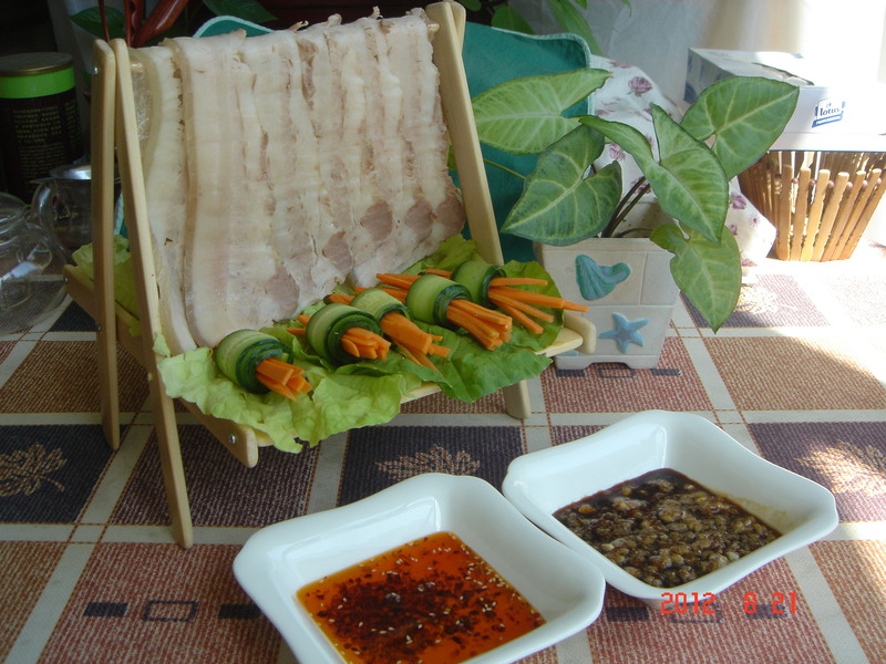及以下步骤:片好的肉片上架依次摆开,生菜叶铺底,料汁分放左右。大家到齐,动手,开吃! 五花肉整条放入冷水锅中加八角、姜片、葱段、料酒、食盐烧开煮20分钟.关火后在锅内浸泡20分钟使其进一步入味。 煮好的五花肉用保鲜膜包好,平直的放入冰箱冷冻半小时,使其挺实、硬朗以便加工成薄片。 五花肉整条放入冷水锅中加八角、姜片、葱段、料酒、食盐烧开煮20分钟.关火后在锅内浸泡20分钟使其进一步入味。 煮好的五花肉用保鲜膜包好,平直的放入冰箱冷冻半小时,使其挺实、硬朗以便加工成薄片。 从冰箱里取出五花肉,打开保鲜膜,顺肉条用刀片成1毫米厚的长片。这时候的刀要磨的非常锋利,片出的肉片才会薄如蝉翼。 这样的捣蒜罐捣出的蒜汁味道浓郁,香醇可口。 大蒜拍扁,用捣蒜罐捣碎成粘稠状,加少许食盐和味精,倒入少量白醋调成沾汁。 胡萝卜切丝,黄瓜用刮刀刮成条状片,卷住胡萝卜丝用作配菜。生菜叶铺底,吃肉沾汁的时候也可以用生菜叶包住肉片吃。 片好的肉片上架依次摆开,生菜叶铺底,料汁分放左右。大家到齐,动手,开吃!