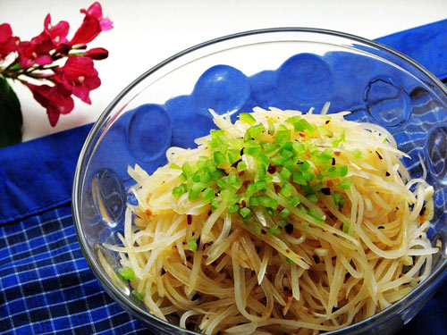 4、4、依据个人的口味将适量的辣椒油、花椒油、香油、白糖、白醋、蒜蓉、盐和味精放入土豆丝中拌匀即可。