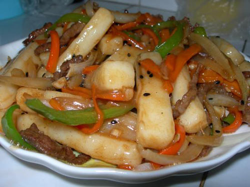 7、锅烧热放油,先炒牛肉,接着放入胡萝卜轻轻翻炒几下,放洋葱炒出香味,放辣椒轻炒几下,放入煮好的年糕翻炒几下,倒入调好的酱汁翻炒(香味即可充满满屋),酱汁收差不多时即可出锅。