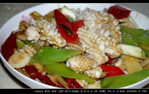 7、泡椒、泡姜、大蒜片,翻炒出香味时,下焯过水的鱿鱼卷。