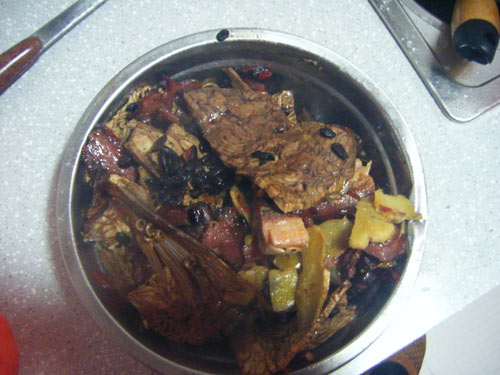 5、最后是摆盘,找一个大口不锈钢碗,最先铺上泡好的豆豉,接着铺上五香豆干片,再是肉片和鱼,最后铺上姜片,根据个人口味加入味精,干辣椒丝,淋上少许香油。将容器放入高压锅大火烧开后蒸40分钟即可。