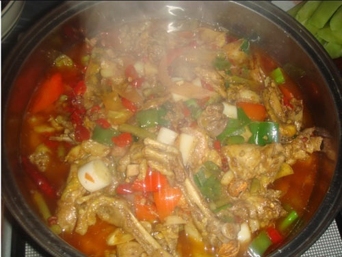 我家的午餐---童子野鸡。此菜先吃菜,吃完菜后將煲野鸡的汤放里面继续煲火锅,真是汤鮮味美。