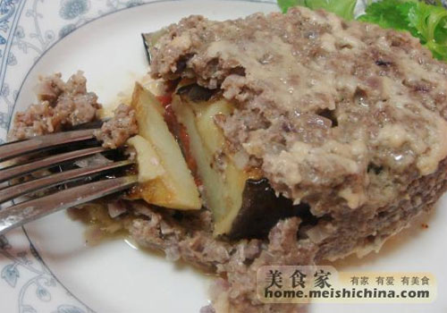 及以下步骤:干酪铺底。 碎奶酪上放了一层肉馅儿。 平底锅上火烧热,放入橄榄油。 把油在锅中摊匀,下入茄子片儿、土豆片儿(薯片要煎透)、番茄片儿中火进行煎烤,材料煎至微黄便好(番茄煎时锁住水份便好,不要煎烂)。 ***** 将小烤模刷少许油,先撒一层干酪垫底,然后再放薄薄一层牛肉馅儿 再放一片煎好的茄子。 茄片上面是土豆片。 再次是番茄片。 然后把另一片茄片盖好。 稍事降温从模具中倒入餐盘内,点缀、装饰、上桌即可招待客人。