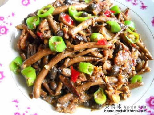 茶树菇是一种高蛋白、低脂肪,营养丰富的食用菌,食之味美、柄脆,香气浓郁、清脆爽口、堪称美味佳肴。茶树菇柄长且脆,鲜食口感极佳,经过干制,其香味更在香菇之上。 茶树菇性平、甘温、无毒,常用作利尿渗湿、健脾止泻之药,具清热、平肝、气喘有独特疗效。且具有良好的防癌抗癌功能,享有中华神菇的美称。 豆豉是我国传统食品,不仅味美、可口,而且它的营养丰富,含有蛋白质、脂肪、糖类及钙、铁、磷、钻、硒、硫胺素、核黄素、尼克酸等。 豆豉中还含有大量能溶解血栓的尿激素,能有效地预防脑血栓形成。具有解表清热,透疹解毒之功效。适用于风热头痛,胸闷呕吐,痰多虚烦等症。