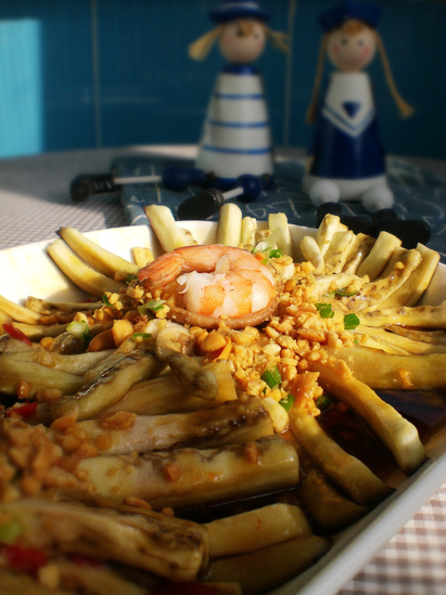 菊花茄子我之前还真是没做过,只是在外面吃到过,油炸的,那是相当高热量~最近减肥,不太喜欢吃油大的东西~我想了想还是决定用清蒸的做法,再加上虾仁和花生碎,那也是相当美味的哦~不知道小羊小小和路过的各位童鞋能否满意呢?