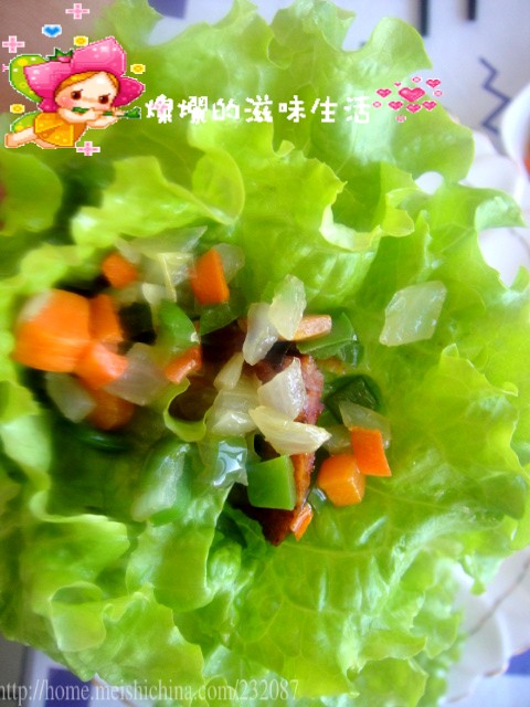 及以下步骤:将肉片铺入烤盘上,烤箱中层200度,烤10分钟,注意中途翻面。 准备好青菜,灿烂用了生菜,洗净后控干水份。 将胡萝卜、青椒、洋葱切小丁。 锅内入油,先倒入胡萝卜炒下。 再倒入洋葱丁、青椒丁。 翻炒均匀。 出锅。 将几片生菜叶,放上肉片,然后再铺上些青菜粒,小心卷起。 出锅。 将几片生菜叶,放上肉片,然后再铺上些青菜粒,小心卷起。