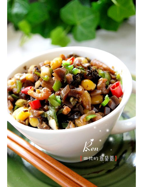 及以下步骤:转中火快速翻炒,将大头菜中的水汽慢慢煸干。 加入青红椒碎叮,继续快速翻炒。 下已经煮熟沥干水分的黄豆粒。 火开大继续翻炒2分钟。 最后加少许味精出锅。 ok~~出锅! 下已经煮熟沥干水分的黄豆粒。 火开大继续翻炒2分钟。 最后加少许味精出锅。 ok~~出锅!