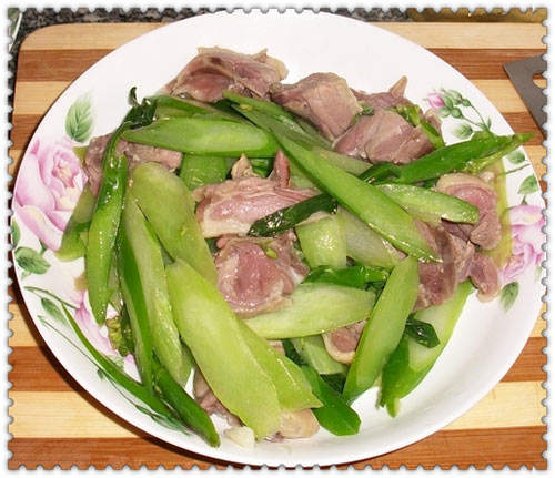 6、放入芥兰腊鸭腿翻炒,因腊鸭腿和芥兰都有咸味,这时就不用放盐了。