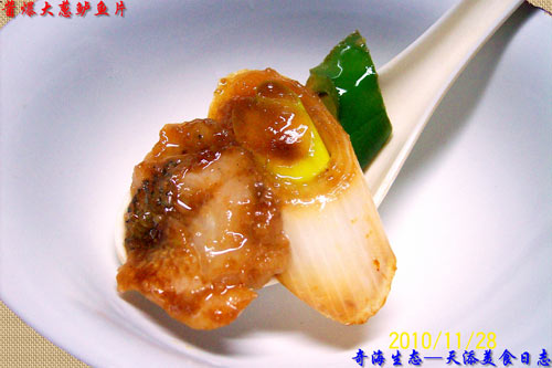 【鲈鱼二吃】《酱爆大葱鲈鱼片》+(蒜苗萝卜鲈鱼汤) (4月28日创意命名) 1、《酱爆大葱鲈鱼片》烹饪方法简介: 1、鲈鱼洗净用刀片下鱼肉切成鱼片,加入葱姜末、花椒粉、细盐、料酒和适量干淀粉浆制10分钟左右; 2、锅淋油入姜片煸香,下鲈鱼片滑炒至变色后取出备用; 3、油锅加入葱伴侣豆瓣酱用文火煸香,然后加入大葱煸炒数下,淋入适量生抽、清水用大火翻炒片刻,最后加入鲈鱼片翻炒、收汁、调味后,即可装盘上桌。 特点: 1、低碳、低油温、无油烟操作,食材普通,食材配置合理,营养均衡,烹饪简单,色香味形俱全,菜名贴切、顺口、祥和。 2、菜肴色泽鲜艳,葱香去腥,鲜香四溢,肉质细腻,鲜嫩爽滑,开胃爽口,口感丰富而微妙,营养丰富。 2、《蒜苗萝卜鲈鱼汤》烹饪方法简介: 1、鲈鱼洗净用刀片去鱼肉,将鱼骨切寸段,入锅煎制后,加入足量清水,盖上锅盖用大火将汤汁烧白; 2、待汤汁烧白后,加入白萝卜以文火炖煮,将白萝卜炖酥; 3、待白萝卜炖酥后,加入大蒜叶拌匀调味后,即可出锅。 特点: 1、【秋冬绿盾】---《蒜苗萝卜鲈鱼汤》是根据在京军旅生涯的饮食而创意,菜肴食材采用加工鲈鱼肉片,所剩下的鱼骨为汤汁基料,烹饪简单、鲜香四溢、口感浓鲜肥美、营养健康、菜式自然、经济实惠、贴近百姓生活; 2、食材配置合理,营养均衡,制作简单,色香味形俱全,菜名贴切顺口; 3、【秋冬绿盾】---《蒜苗萝卜鲈鱼汤》在秋冬季流行性疾病高发期食用,可预防和降低流行性传染疾病的感染机率。