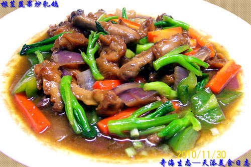 【飞禽美味精典】---《根茎蔬果炒乳鸽》又名《时蔬根茎炒乳鸽》(11月30日创意命名) 烹饪方法简介: 1、乳鸽洗净改刀成寸块,入葱姜末、胡椒粉、细盐、料酒和适量干淀粉浆制20分钟左右,胡萝卜洗净切条,选择芥蓝菜菜茎洗净备用; 2、原锅加入姜片煸香,下乳鸽块滑炒至变色,六成熟后取出装盘备用; 3、油锅加入洋葱、胡萝卜煸香,然后加入芥蓝菜茎、青椒煸炒数下,淋入适量生抽、清水用大火翻炒片刻,然后,加入乳鸽肉块,盖上锅盖将乳鸽烧熟,乳鸽烧熟后,用大火收汁调味后,即可装盘上桌。 特点: 1、低碳、低油温、无油烟操作,食材普通,食材配置合理,营养均衡,烹饪简单,色香味形俱全,菜名贴切、顺口、祥和。 2、菜肴色泽鲜艳,葱香扑鼻,鲜香四溢,肉质细腻鲜嫩,青椒、芥蓝菜清脆爽口,口感丰富而微妙,营养均衡; 3、富含矿物质、微量元素营养及纤维素的蔬菜植物根茎果与营养价值极高的乳鸽,特别适宜生长发育期儿童,以及康复保健疗理。 营养价值: 乳鸽味咸、性平、无毒;具有滋补肝肾之作用,可以补气血,托毒排脓;可用以治疗恶疮、久病虚赢、消渴等症。常吃可使身体强健,清肺顺气。