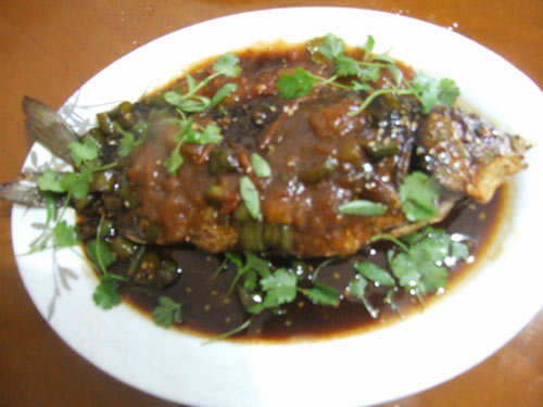 及以下步骤:将新鲜鲫鱼双面抹上食盐,挂在通风处数小时(根据气温情况时间有所不同,现在深圳20多度的气温2-3小时就可以了)自然风干。然后将锅烧热加入少许色拉油和生姜,烧至七成热后放入风干后的鲫鱼。 先大火后小火将鱼煎至两面金黄从锅中盛出,先放在一边。下面开始做秘制西红柿酱了。 将新鲜鲫鱼双面抹上食盐,挂在通风处数小时(根据气温情况时间有所不同,现在深圳20多度的气温2-3小时就可以了)自然风干。然后将锅烧热加入少许色拉油和生姜,烧至七成热后放入风干后的鲫鱼。 先大火后小火将鱼煎至两面金黄从锅中盛出,先放在一边。下面开始做秘制西红柿酱了。 将新鲜鲫鱼双面抹上食盐,挂在通风处数小时(根据气温情况时间有所不同,现在深圳20多度的气温2-3小时就可以了)自然风干。然后将锅烧热加入少许色拉油和生姜,烧至七成热后放入风干后的鲫鱼。 先大火后小火将鱼煎至两面金黄从锅中盛出,先放在一边。下面开始做秘制西红柿酱了。 将西红柿切丁放入烧热油锅中,然后放入酱油、糖、醋,小火慢烧数分钟。 最后做好的西红柿酱。很简单吧?!绝对秘制!今天开始外传啦!呵呵!自己做纯天然,而且吃过的亲朋都说比外面卖的好吃哟!你也可以试试。 再将刚才煎好的阳干鲫鱼放入烧热的油锅中,然后放入切成丁的湖南椒、生白芝麻、酱油、豆瓣酱、糖和醋(调料根据自己口味放),调小火慢烧3-5分钟入味即可。 最后盛盘,浇上秘制西红柿酱,洒上香菜叶做点缀。大功告成。