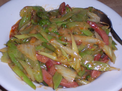 及以下步骤:炒出香味后,放入香肠,尽量把香肠中的油煸出。 开大火,控干水的芹菜放入,点少量酱油,少许食盐,翻炒均匀,点一点薄芡。 放入剩余的葱青,一点鸡精,出锅。 准备白或红腐乳,素鸡辣酱或者蒜茸辣酱。 少量香肠,最好选择有肠衣的那种。 烧开一锅水,点入食油,食盐后放入芹菜。一两分钟即可,捞出后放入凉水中。 取炒锅,凉锅凉油,依次放入葱白,腐乳两块,辣酱一勺,中小火炒匀。 炒出香味后,放入香肠,尽量把香肠中的油煸出。 开大火,控干水的芹菜放入,点少量酱油,少许食盐,翻炒均匀,点一点薄芡。 放入剩余的葱青,一点鸡精,出锅。