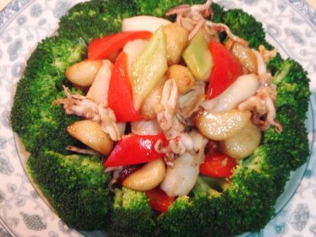 西兰花(150克) / 红甜椒(50克) / 小墨鱼仔(200克)