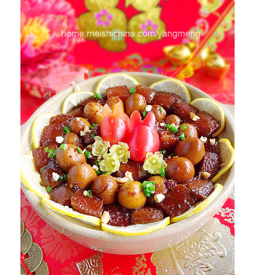 鹌鹑蛋被认为是动物中的人参,是一种很好的滋补品,在营养上有独特之处,故有 "卵中佳品"之称。元宝红烧肉这道菜中金黄色的鹌鹑蛋看起来像一个个小元宝,与其富含的营养价值相对应。红烧肉,红彤彤亮晶晶,象征着事业的红红火火,配上香菜和梅花的点缀,预兆着来年事业的兴旺,财源广进。 这个菜装在煲里,像个聚宝盘,故体现出招财进宝的寓意。 此菜口味咸香浓郁,红烧肉软糯滑嫩,肥而不腻,鹌鹑蛋吸足了汤汁,香气四溢。