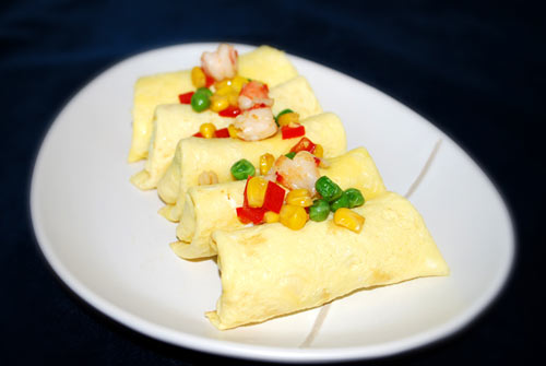 及以下步骤:等虾仁变色后,加入1茶匙日式酱油和少许盐调味。 盛出放凉备用。 2个全蛋和2个蛋黄。 加入2克盐打散。 小煎锅刷层油。 放入蛋液中火摊好蛋皮,放凉。 将炒好的玉米虾仁丁放入蛋皮中,像卷春卷一样卷好。 装盘,撒些彩丁装饰即可。 将炒好的玉米虾仁丁放入蛋皮中,像卷春卷一样卷好。 装盘,撒些彩丁装饰即可。