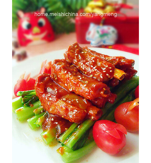 及以下步骤:原料图如图。 排骨焯水,加葱姜八角煮半小时,捞出控水,排骨汤不要倒掉。 原料图如图。 排骨焯水,加葱姜八角煮半小时,捞出控水,排骨汤不要倒掉。 原料图如图。 排骨焯水,加葱姜八角煮半小时,捞出控水,排骨汤不要倒掉。 锅中倒油炒排骨,煎到肉金黄。(不怕费事的就炸)。 排骨捞出后,全部油倒出去,锅里放酱汁,煮排骨的汤,一起熬滚。 排骨倒入煮开焖一会。 大火收汁,放点味精提味即可。撒芝麻装饰。菜薹焯水码放底下垫盘。